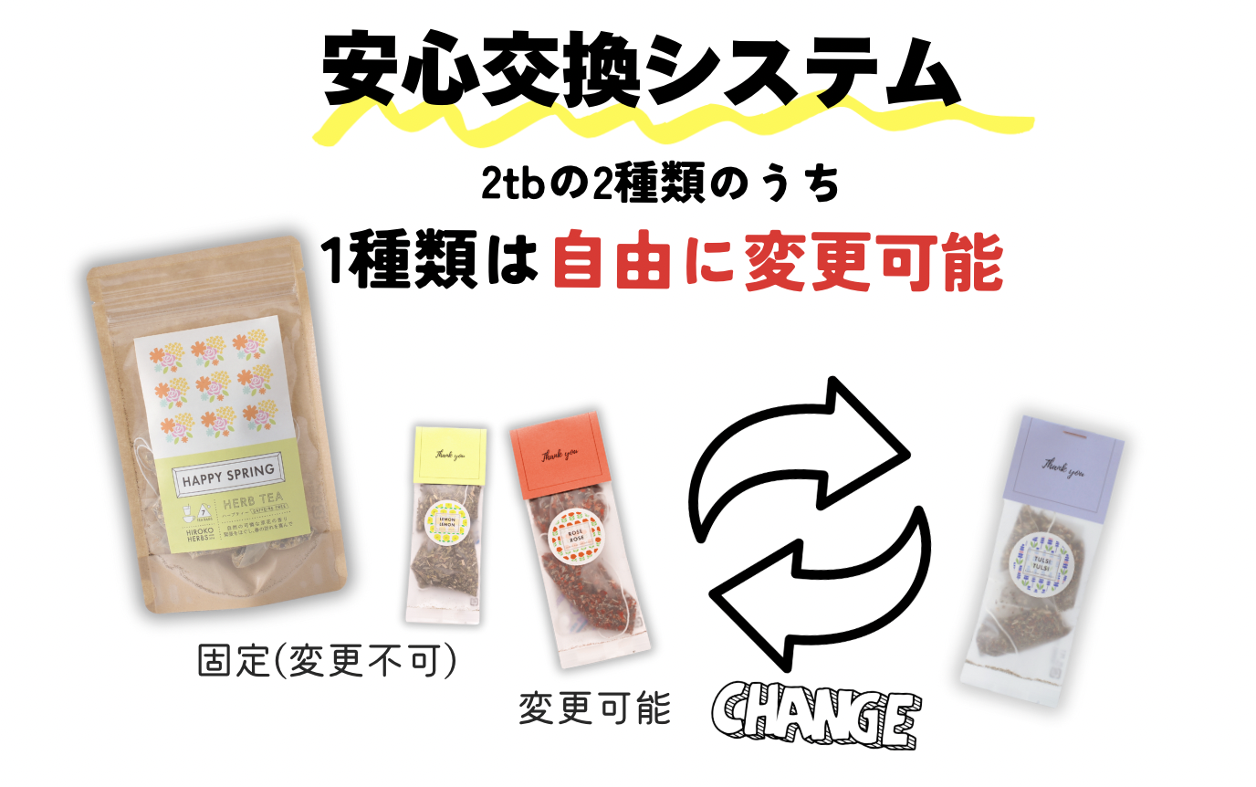 「合計3種類」のハーブティーが毎月届きます。そのうち、指定された2包入商品の1種類があなたのお好みハーブティーと交換可能です!!