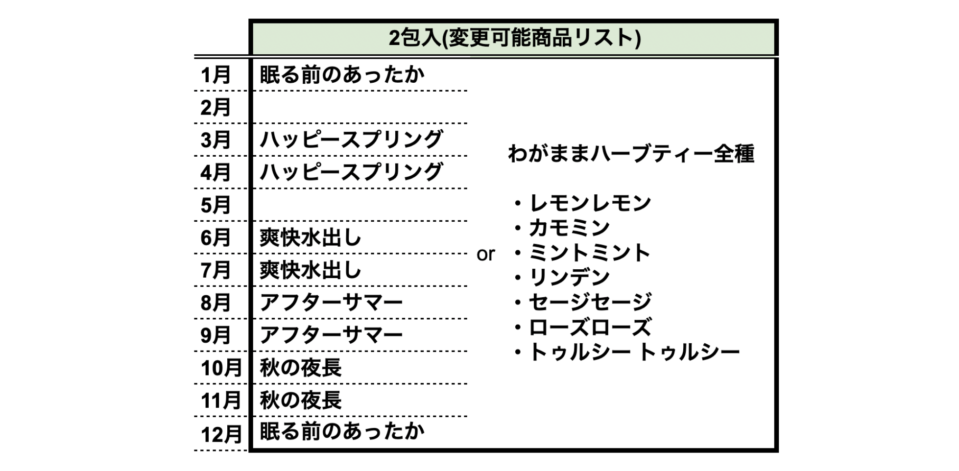 ※交換希望がない場合は、年間カレンダー通りお届けします。詳細のお届けハーブティーに関しては、ページ途中で紹介。