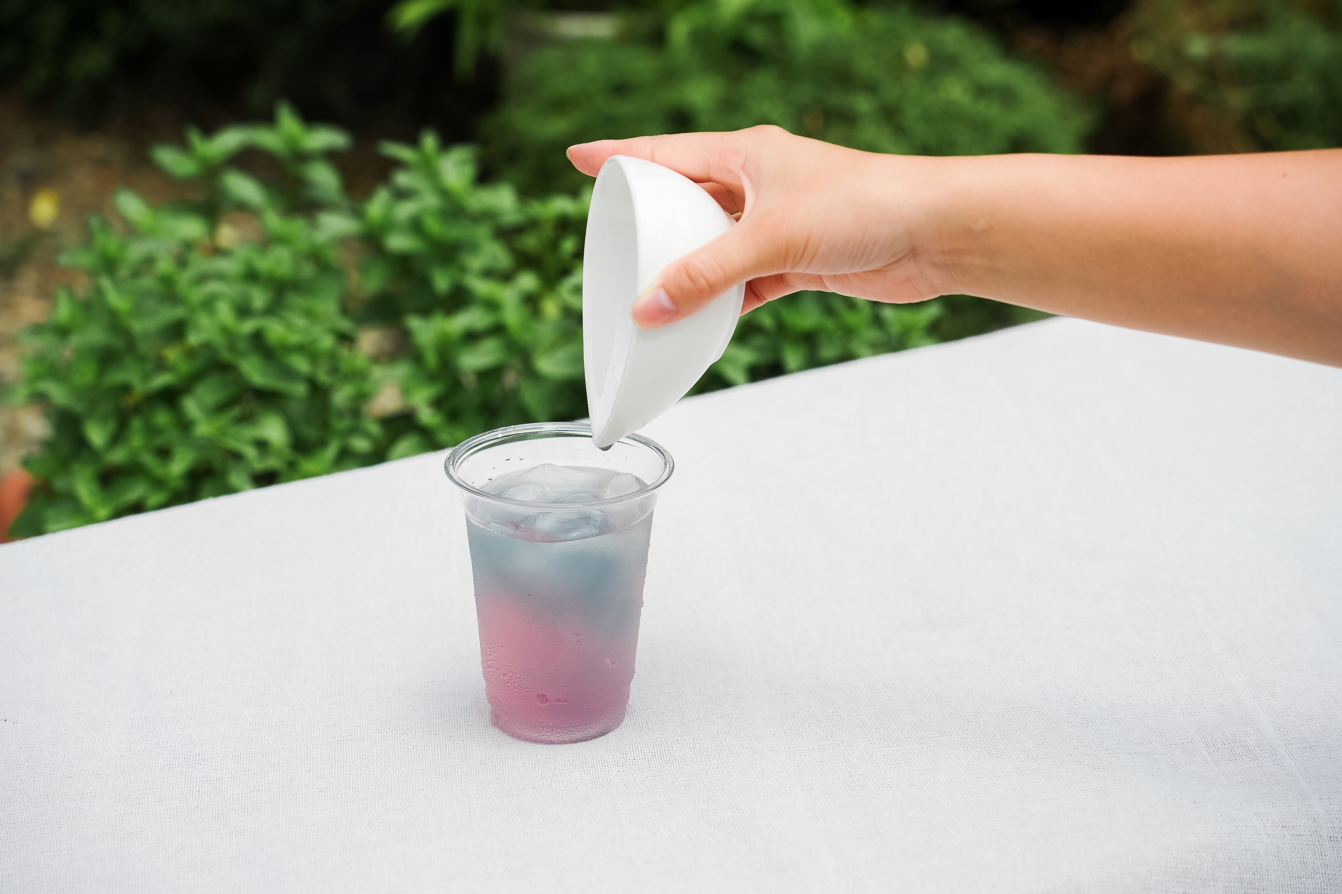 そこにレモンやライムをひとしぼり加えると、魔法のように青から紫、そして赤へと色が変化します 。