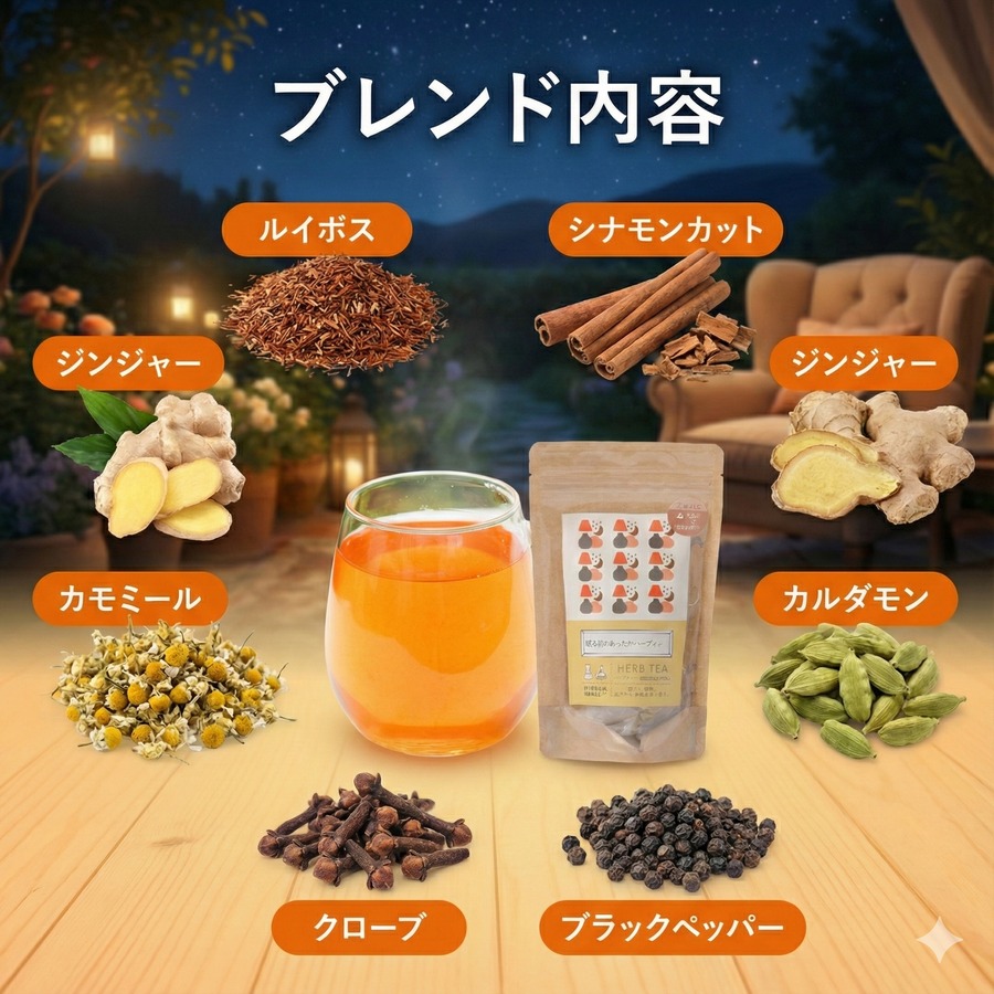 この商品には、ポカポカ芳ばしいスパイスもたっぷりと配合されています。